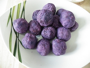 紫薯压碎团成圆子。喜欢奶香味可加点奶粉,糖就不必加了,本身很甜。